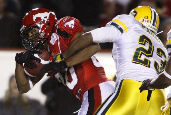 Edmonton Eskimos defender Byron Parker tackles Calgary Stampeders receiver Jeremaine Copeland during the first half of their game in Calgary on Friday.TODD KOROL