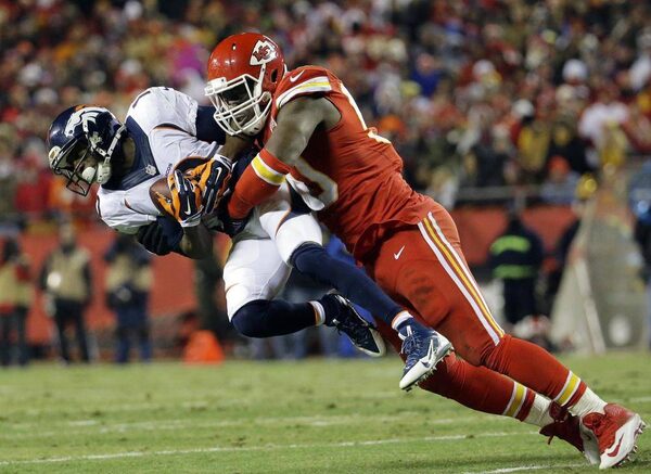 Denver Broncos wide receiver Emmanuel Sanders is tackled by Kansas City Chiefs outside linebacker Justin HoustonCharlie Riedel/The Associated Press