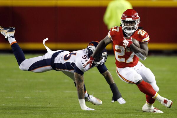 Kansas City Chiefs running back Kareem Hunt evades a tackle from Denver Broncos linebacker Shane Ray in Kansas City on Monday night.Colin E. Braley/The Associated Press