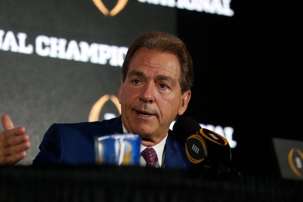 Head coach Nick Saban of the Alabama Crimson Tide speaks to members of the media during a press conference on Jan. 8, 2017 in Tampa.Brian Blanco/Getty Images