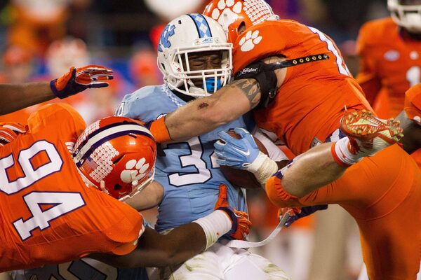 North Carolina’s Elijah Hood carries the ball as the Clemson Tigers defend during the ACC championship game on Dec. 6.Jeremy Brevard