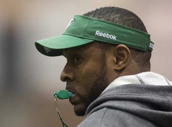 Saskatchewan Roughriders head coach Corey Chamblin runs a drill as he takes part in practice before the upcoming 101st CFL Grey Cup against the Hamilton Tiger-Cats in Moose Jaw, Sask., on Wednesday, Nov. 20, 2013.Nathan Denette/The Canadian Press