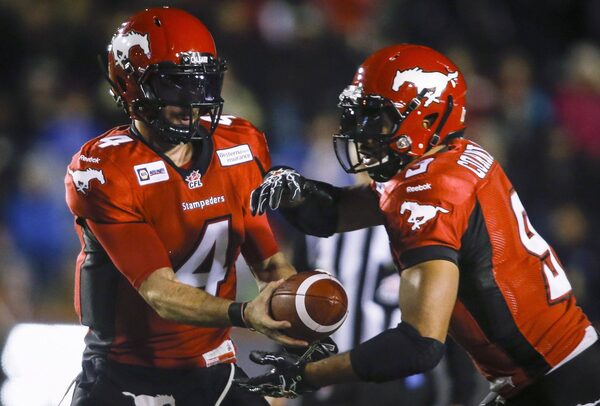 Calgary Stampeders quarterback Drew Tate, left, hands the ball off to teammate Jon Cornish during first quarter CFL football action against the B.C. Lions in Calgary, Saturday, Sept. 27, 2014.The Canadian Press