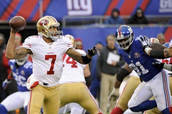 San Francisco 49ers quarterback Colin Kaepernick (7) throws a pass during the second half of an NFL football game against the New York Giants Sunday, Nov. 16, 2014, in East Rutherford, N.J.Bill Kostroun/The Associated Press