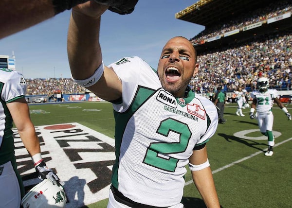 Saskatchewan Roughriders' Sandro DeAngelis (2) celebrates after kicking the winning field goal in the last seconds of the second half of their CFL game in Winnipeg Sunday, September 9, 2012.John Woods/The Canadian Press