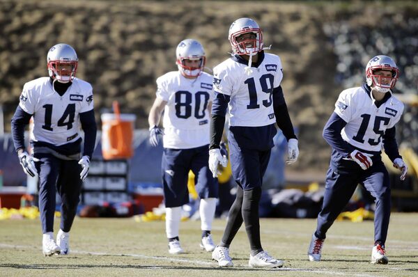New England Patriots wide receivers Michael Floyd (14), Danny Amendola (80), Malcolm Mitchell (19) and Chris Hogan (15) warm up during NFL football practice, Wednesday, Jan. 11, 2017, in Foxborough, Mass.Elise Amendola/The Associated Press