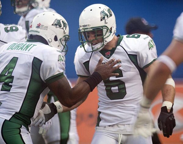Saskatchewan Roughriders wide receiver Rob Bagg (6) is congratulated by quarterback Darian Durant (4) after scoring a touchdown against the Toronto Argonauts during first quarter CFL action in Toronto on Thursday July 11, 2013.Frank Gunn/The Canadian Press