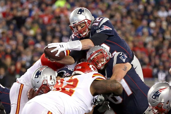 New England Patriots quarterback Tom Brady scores a rushing touchdown in the second quarter of a win over the Kansas City Chiefs on Jan. 16.Jim Rogash/Getty Images