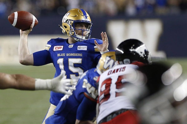 Winnipeg Blue Bombers quarterback Matt Nichols (15) throws against the Calgary Stampeders during the second half of CFL action in Winnipeg on July 21, 2016.John Woods/The Canadian Press