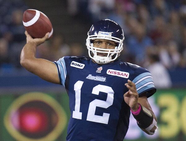 Toronto Argonauts quarterback Jarious Jackson throws the football against the Montreal Alouettes during first half CFL football action in Toronto on Sunday, Oct. 14, 2012. THE CANADIAN PRESS/Nathan DenetteNathan Denette/The Canadian Press