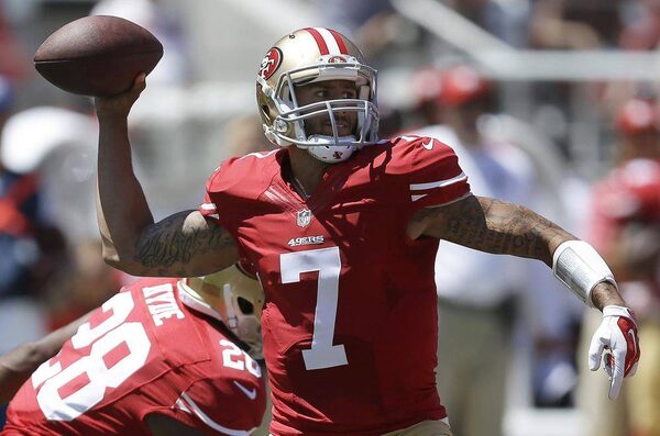 FILE - In this Aug. 17, 2014, file photo, San Francisco 49ers quarterback Colin Kaepernick (7) passes against the Denver Broncos during the first quarter of an NFL preseason football game.Ben Margot/The Associated Press