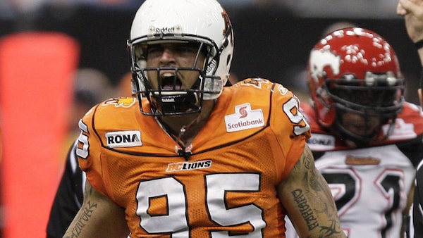 BC Lions Ricky Foley celebrates his tackle on Calgary Stampeders Joffrey Reynolds (rear) during CFL football action in Vancouver, British Columbia, October 31, 2009. REUTERS/Lyle StaffordLYLE STAFFORD/Reuters