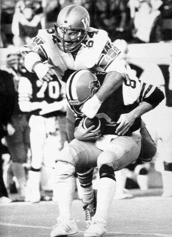 Charging Winnipeg Blue Bomber lineman Doug MacIver (64) sacks Hamilton quarterback Dave Marler in the fourth quarter of a CFL game in Hamilton in 1982.The Canadian Press