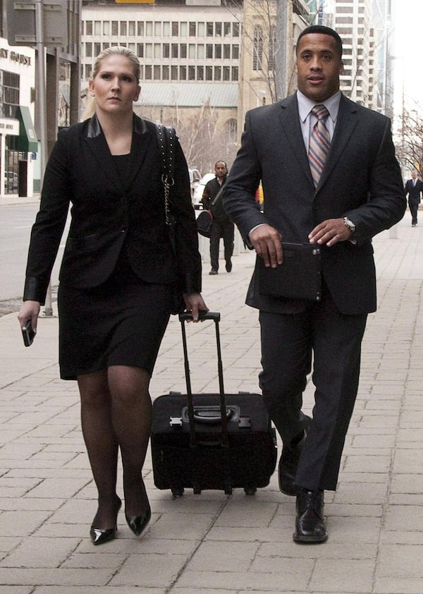 Former Calgary Stampeders player Joffrey Reynolds leaves court with his lawyer Randi CollinsJeff McIntosh/The Canadian Press