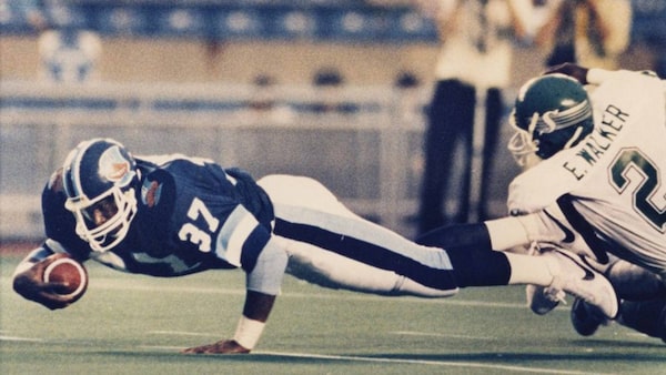 Toronto Argonauts fullback Warren Hudson (left) dives past Saskatchewan Roughriders Eddie Ray Walker during CFLaction in Toronto, July 17, 1986. Hudson has died of brain cancer at the age of 49.The Canadian Press