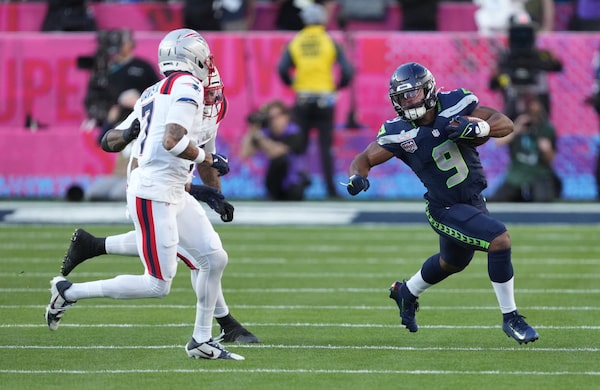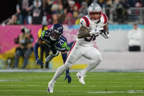 Patriots cornerback Carlton Davis III tackles Seahawks running back Kenneth Walker III during the fourth quarter.Mark J. Rebilas/Reuters