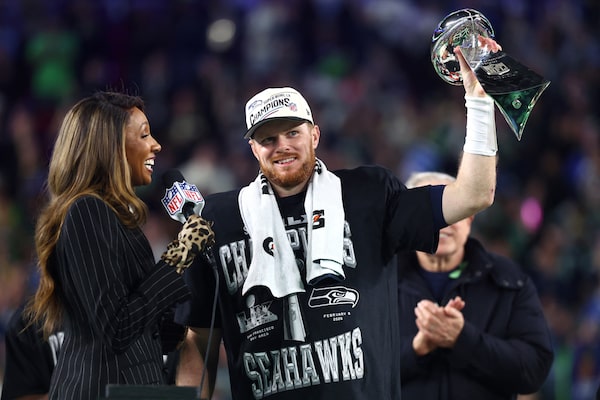 Seattle Seahawks quarterback Sam Darnold celebrates with the Vince Lombardi trophy after defeating the New England Patriots in Super Bowl LX.Mark J. Rebilas/Reuters