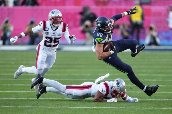 Seattle Seahawks tight end AJ Barner scores a touchdown against the Patriots.Mark J. Rebilas/Reuters
