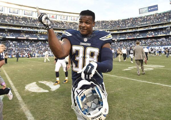 San Diego Chargers strong safety Marcus Gilchrist (38) celebrates on the field after the Chargers defeated the St. Louis Rams 27-24 in an NFL football game, Sunday, Nov. 23, 2014, in San Diego.DENIS POROY/The Associated Press