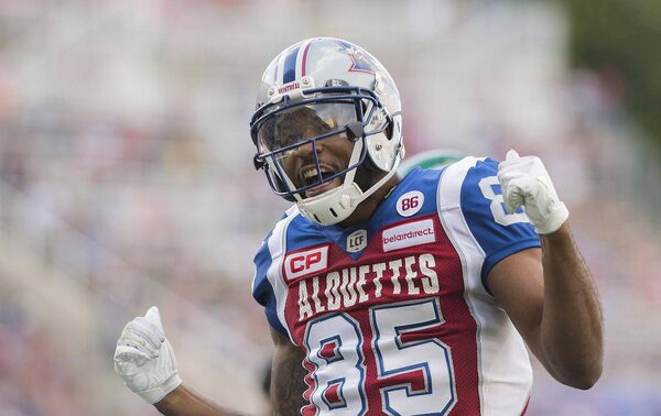Montreal Alouettes' B.J. Cunningham celebrates after scoring a touchdown during first half CFL football action against the Saskatchewan Roughriders in Montreal, Friday, July 29, 2016.Graham Hughes/The Canadian Press