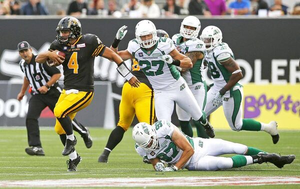 Hamilton Tiger-Cat's quarterback Zach Collaros (L) runs the ball past Saskatchewan Roughriders' John Chick (97) and Brian Peters (27) during the second half of their CFL football game in Hamilton, September 14, 2014.MARK BLINCH/Reuters