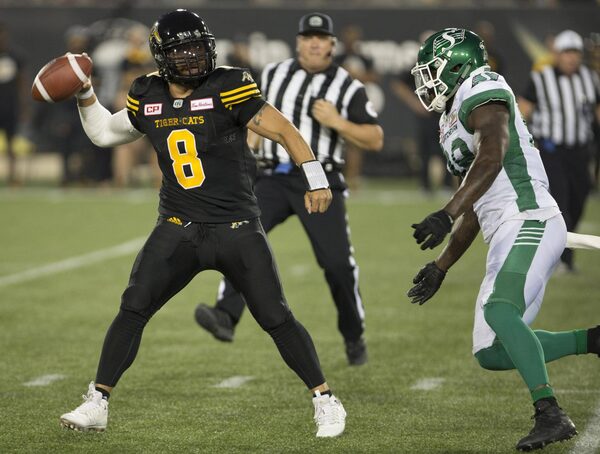 Hamilton Tiger-Cats quarterback Jeremiah Masoli prepares to throw while being pressured by Saskatchewan Roughriders defensive lineman A.C. Leonard during a game in Hamilton, Ont., on Friday, Sept. 15, 2017.Peter Power/The Canadian Press