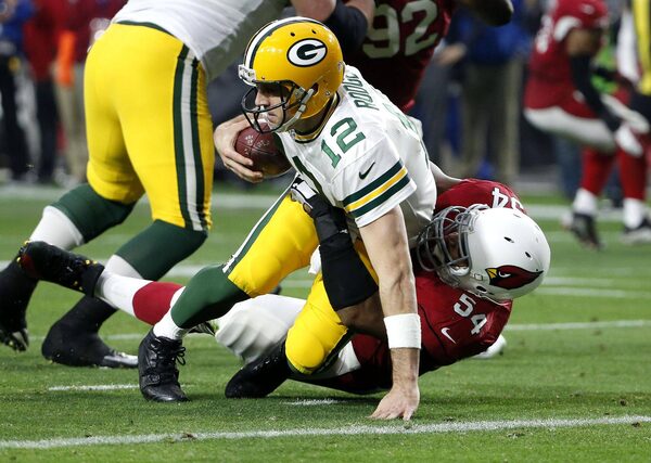 In this Dec. 27, 2015, file photo, Green Bay Packers quarterback Aaron Rodgers is sacked by Arizona Cardinals inside linebacker Dwight Freeney. Three weeks ago, the Arizona Cardinals beat the Green Bay Packers by 30 points. No one should expect that kind of blowout when the teams meet again Saturday night, this time in the NFC divisional playoffs.Ross D. Franklin/The Associated Press