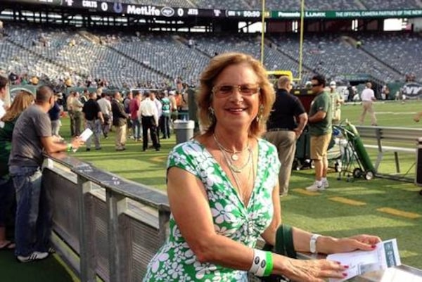 Connie Carberg, a scout for the New York Jets from 1976 to 1980, poses near the sideline at MetLife Stadium on Aug. 7, 2014.Elisabeth Meinecke/The Associated Press