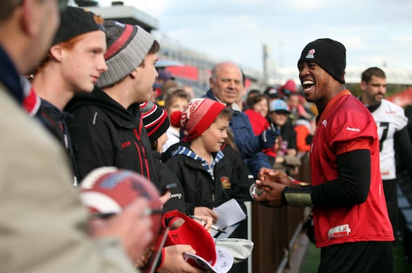 Henry Burris signs autographs for fans after the Ottawa RedBlacks’ practice on Friday at TD Place in Ottawa.Dave Chan