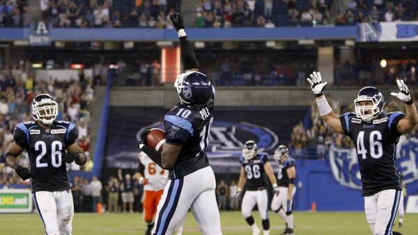 Toronto Argonauts Willie Pile (C) celebrates his interception with teammates Jordan Younger and Jason Pottinger (L) against the B.C. Lions during the second half of their CFL football game in Toronto July 23, 2010. REUTERS/Mark BlinchMARK BLINCH/Reuters