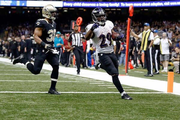 Justin Forsett #29 of the Baltimore Ravens rushes for a touchdown during the fourth quarter of a game against the New Orleans Saints at the Mercedes-Benz Superdome on November 24, 2014 in New Orleans, Louisiana.Wesley Hitt/Getty Images
