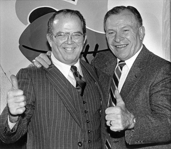 Former Toronto Argonauts’ general manager and coach Leo Cahill, left, poses with team president Ralph Sazio in 1985.John Felstead