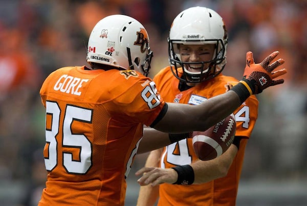 B.C. Lions' Shawn Gore, left, celebrates his touchdown reception with quarterback Travis Lulay during the first half of a CFL football game against the Montreal Alouettes in Vancouver, B.C., on Sunday September 15, 2013.DARRYL DYCK/The Canadian Press