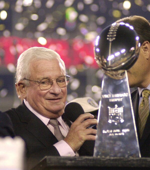 FILE - In this Jan. 28, 2001 file photo, Baltimore Ravens owner Art Modell celebrates with the Vince Lombardi Trophy after the Ravens beat the New York Giants 34-7 in Super Bowl XXXV in Tampa, Fla.Dave Martin/The Associated Press