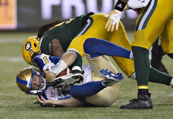 Winnipeg Blue Bombers quarterback Matt Nichols (15) is sacked by Edmonton Eskimos' Marcus Howard (91) during second half CFL action in Edmonton, Alta., on Thursday July 28, 2016.JASON FRANSON/The Canadian Press