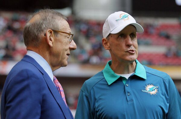 Miami Dolphins owner Stephen Ross, left, and Miami Dolphins head coach Joe Philbin chat during warm-up before the NFL football game between the New York Jets and the Miami Dolphins and at Wembley stadium in London, Sunday, Oct. 4, 2015.Tim Ireland/The Associated Press