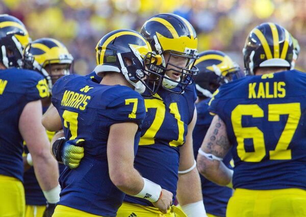 In this Sept. 27, 2014, photo, Michigan quarterback Shane Morris (7) leans against offensive lineman Ben Braden (71) after taking a hit in the fourth quarter of an NCAA college football game against Michigan in Ann Arbor, Mich.Tony Ding/The Associated Press