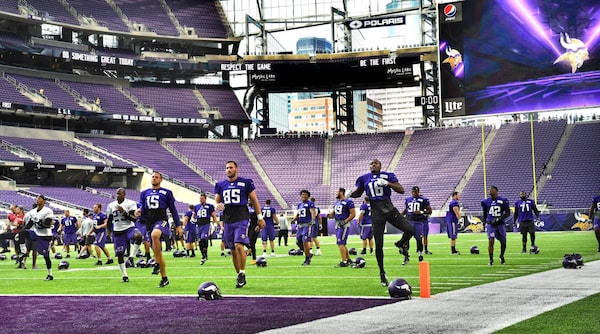 Minnesota Vikings players stretch before their first NFL football practice at U.S. Bank Stadium on Aug. 26, 2016.Jean Pieri/The Associated Press