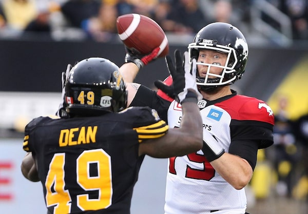 Calgary Stampeders quarterback Bo Levi Mitchell (19) passes as Hamilton Tiger-Cats' Larry Dean defends during the first-half of CFL football action in Hamilton on Saturday, October 1, 2016.Peter Power/The Canadian Press