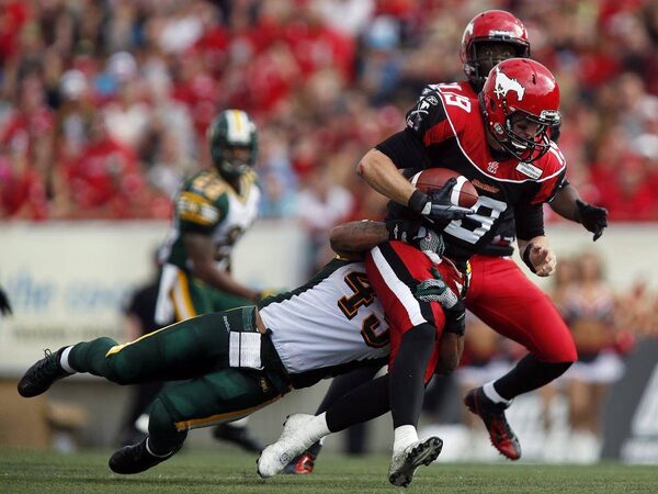 Edmonton Eskimos' Mike Cornell, left, sacks Calgary Stampeders' quarterback Bo Levi Mitchell, during second half CFL action in Calgary, Alta., Monday, Sept. 2, 2013.Jeff McIntosh/The Canadian Press