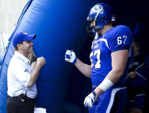 Danny Maciocia (L), coach of University of Montreal Carabins football team greets offensive linesman David Foucault prior to their opening game against the McGill Redmens on September 1, 2011.Christinne Muschi/The Globe and Mail
