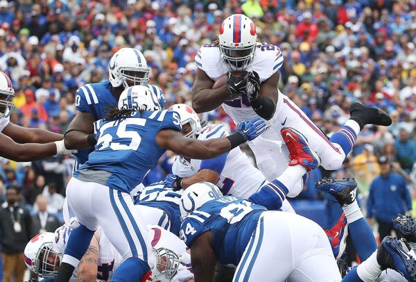 Buffalo Bills’ Boobie Dixon jumps into the endzone for a touchdown against the Indianapolis Colts during the first half at Ralph Wilson Stadium on Sept. 13 in Orchard Park, N.Y.Tom Szczerbowski/Getty Images