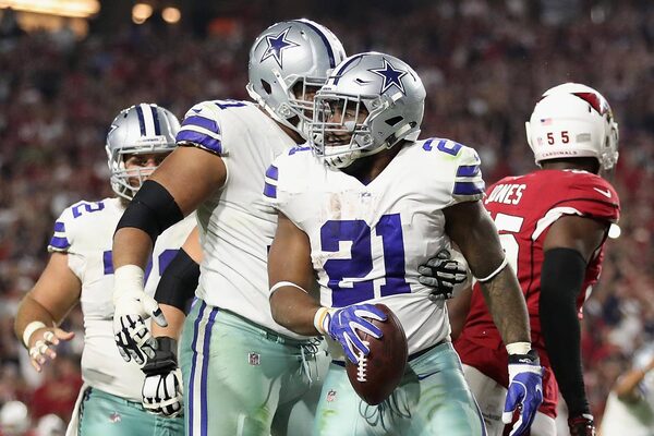 Dallas Cowboys running back Ezekiel Elliott reacts after scoring an eight yard touchdown during the fourth quarter of the NFL game against the Arizona Cardinals at the University of Phoenix Stadium, on Sept. 25, 2017.Christian Petersen/Getty Images