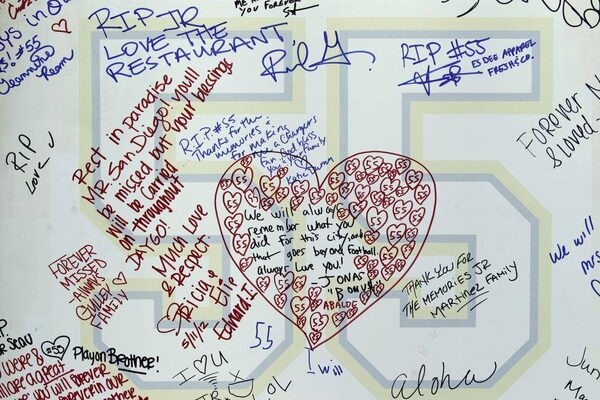 Messages are written on a board emblazoned with a No. 55 during a public memorial service for late football player Junior Seau, who committed suicide last MayGregory Bull/The Associated Press