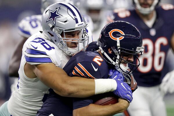 Tyrone Crawford #98 of the Dallas Cowboys tackles Brian Hoyer #2 of the Chicago Bears in the first quarter during a game between the Dallas Cowboys and the Chicago Bears at AT&T Stadium on September 25, 2016 in Arlington, Texas.Ronald Martinez/Getty Images