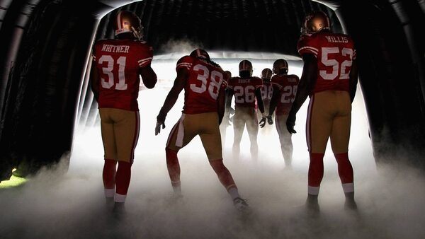 Donte Whitner #31, Dashon Goldson #38 and Patrick Willis #52 of the San Francisco 49ers prepare to run on to the field for their game against the Oakland Raiders at Candlestick Park on August 20, 2011 in San Francisco, California. The 49ers won 17-3. (Photo by Ezra Shaw/Getty Images)Ezra Shaw/Getty Images