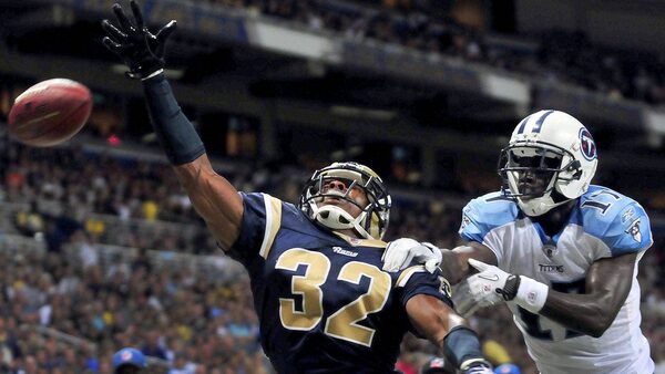 St. Louis Rams cornerback Bradley Fletcher, left, knocks away a pass intended for Tennessee Titans wide receiver Damian Williams during the second quarter of an NFL football game Saturday, Aug. 20, 2011, in St. Louis. The Rams won 17-16. (AP Photo/Jeff Curry)Jeff Curry/The Associated Press