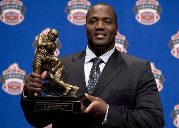 B.C. Lions offensive tackle Jovan Olafioye holds the trophy for Most Outstanding Offensive lineman trophy as he poses for photographers during the CFL awards show in Toronto Thursday, November 22, 2012. With Olafioye saying no to the NFL, the B.C. Lions have fewer worries about their injury-riddled offensive line with the return of the CFL's top lineman last season.Sean Kilpatrick/The Canadian Press