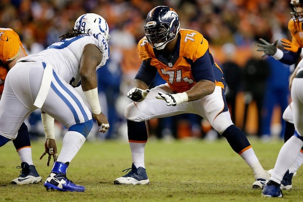 Orlando Franklin, right, seen during a 2015 Broncos game against the Colts, started 70 of 71 games over four seasons with Denver.Ezra Shaw/Getty Images