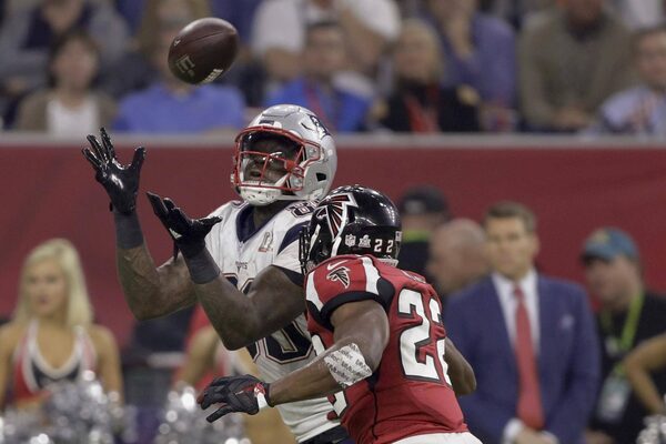 New England Patriots' Martellus Bennett eyes the ball under pressure from Atlanta Falcons' Keanu Neal, during the second half of the NFL Super Bowl 51 football game Sunday, Feb. 5, 2017, in Houston.Darron Cummings/The Associated Press